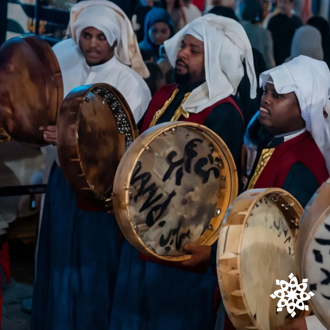 - طاقم الفرقة مزود بالطبول وزي الايزار، السديري والدشداشة